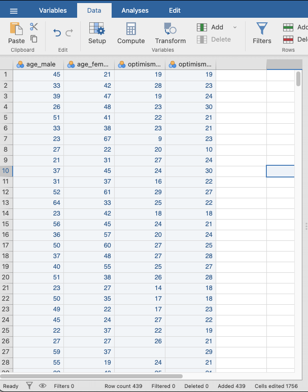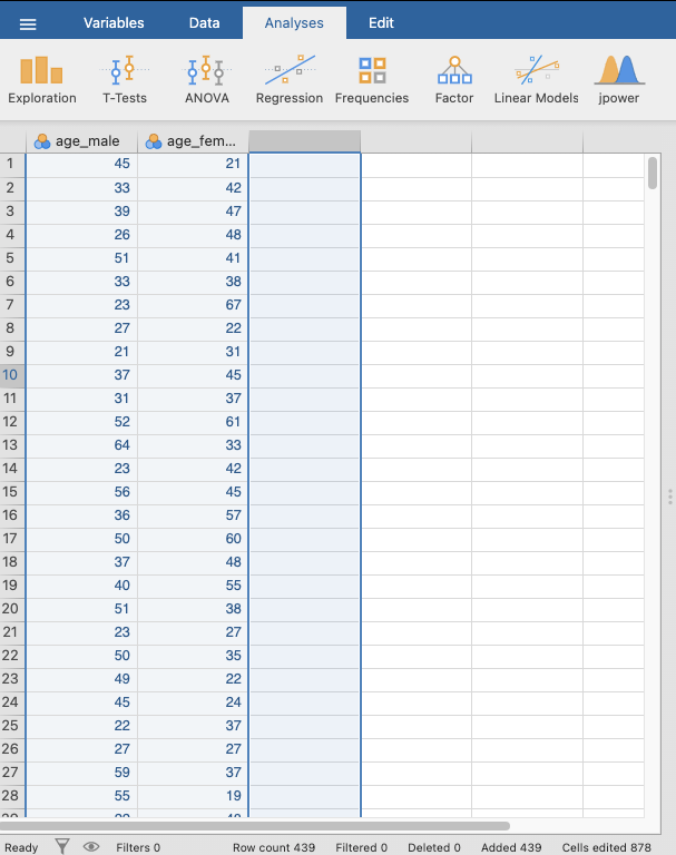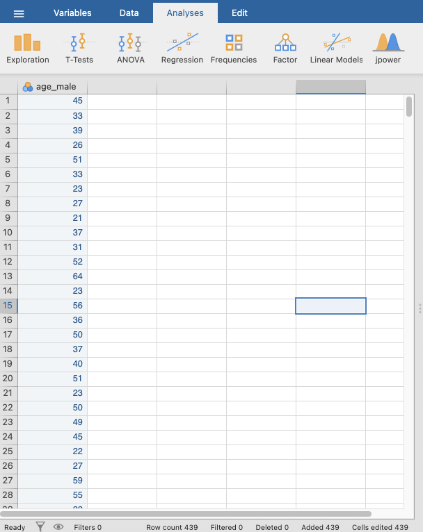 - Copy the data in the age column for the male participants and open a new Jamovi sheet.