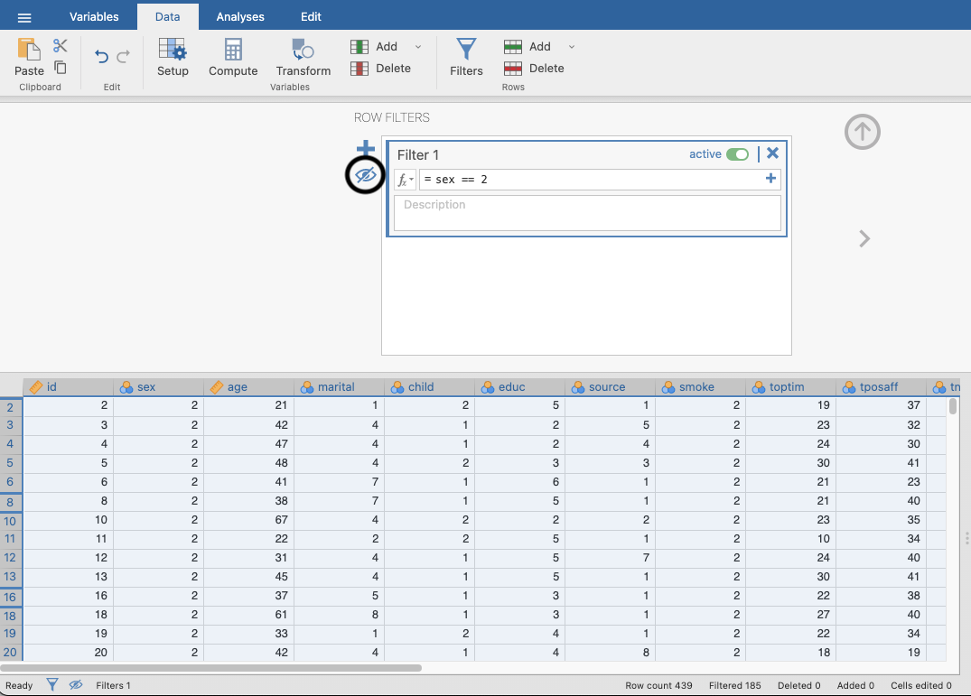 - Go back to your original Jamovi sheet and reopen the filter. Change the code to sex == 2. This will give you the female data.