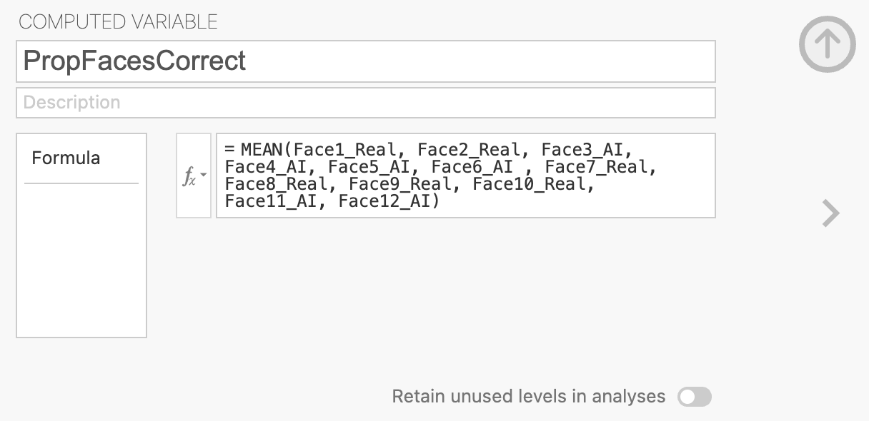 The variable is defined within the formula box below the name definitions. We want to compute the average accuracy across all 12 faces so we can add the formula to compute that into the box.