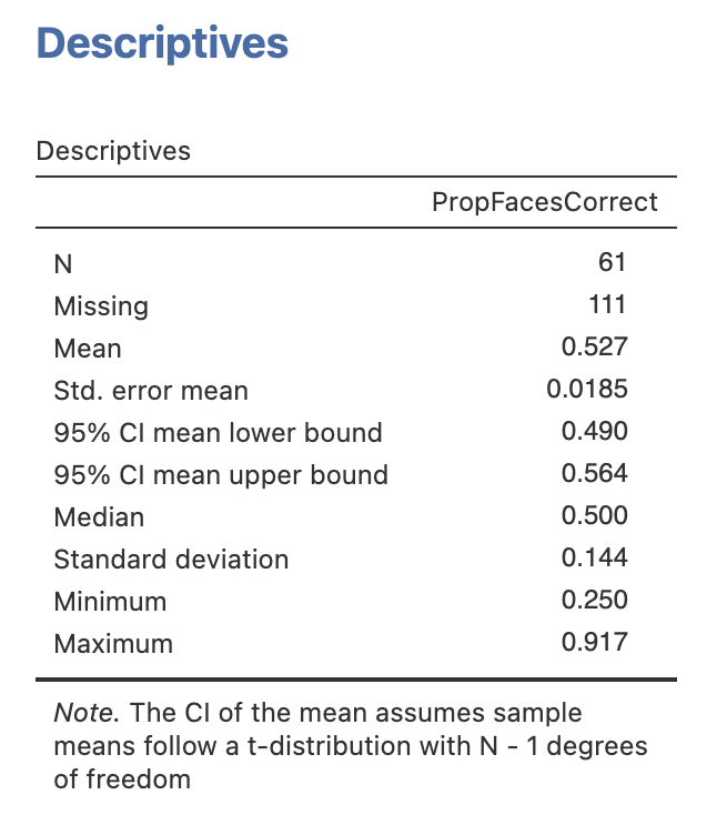 One critical piece of information is missing though! we have accuracy for each individual face but not an overall score for each participant. We’ll need to compute this new variable ourselves from the average accuracy of all twelve faces.