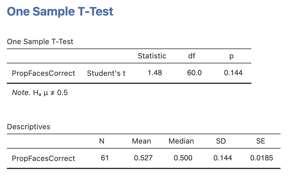 Run a one sample t-test testing whether the proportion of correctly identified faces was above chance level for the group, include some descriptive statistics to help you interpret the result.