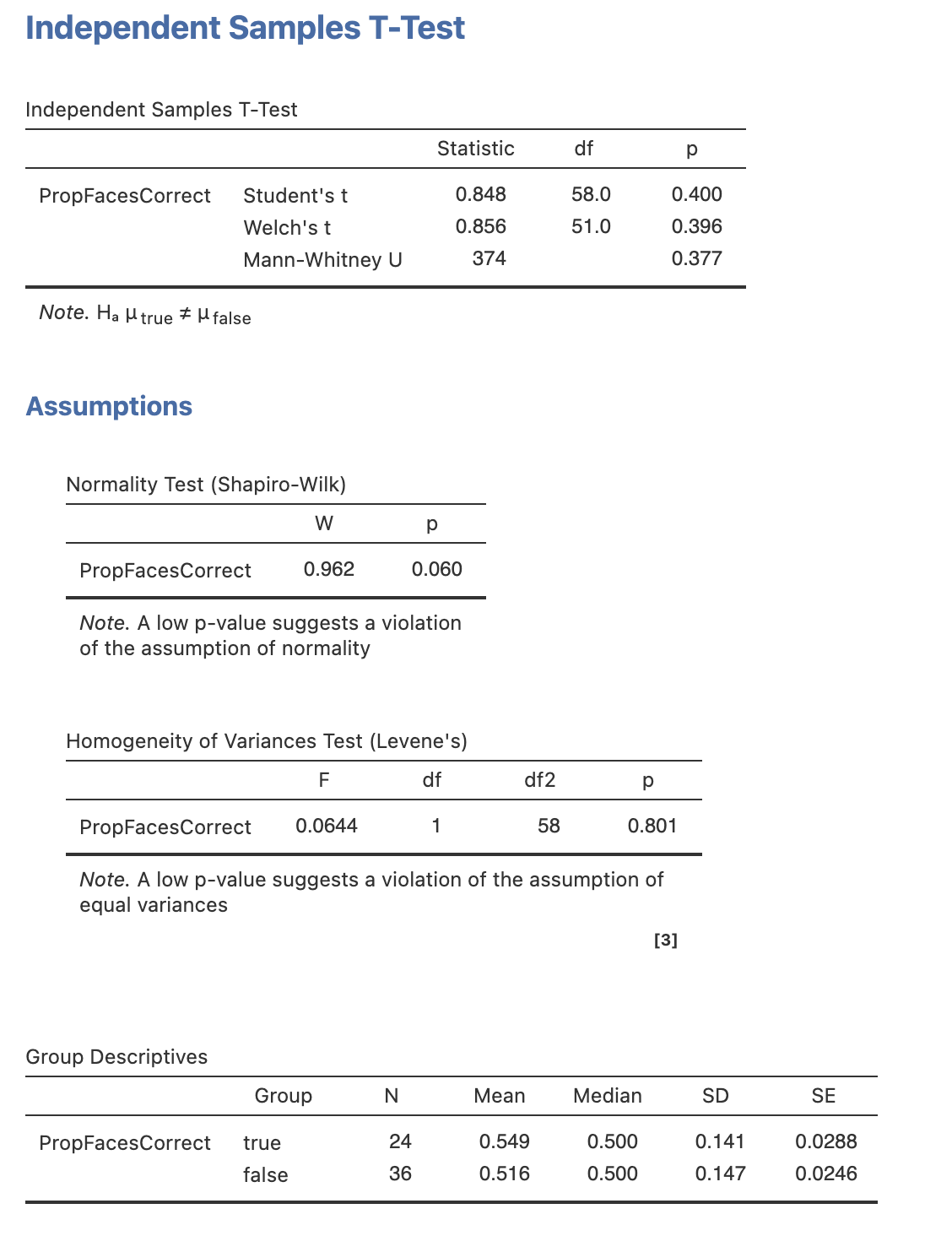 Open the ‘Independent Sample t-test’ menu under ‘t-tests’. To run the analysis, drag PropFacesCorrect across as our dependent variable and our new ConfidentBefore variable as the grouping variable. The results should appear on the right automatically.