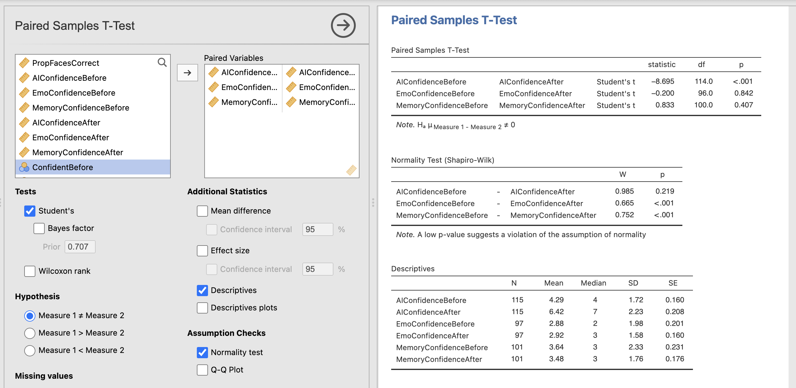 Once you have computed the core test, do the same for the EmoConfidence and MemoryConfidence, and add the following options: