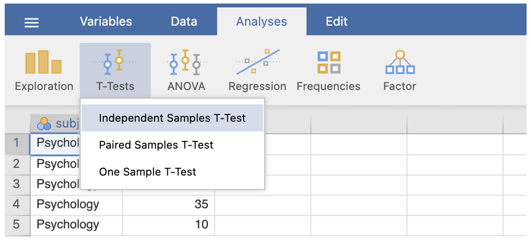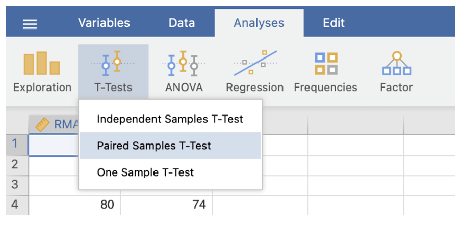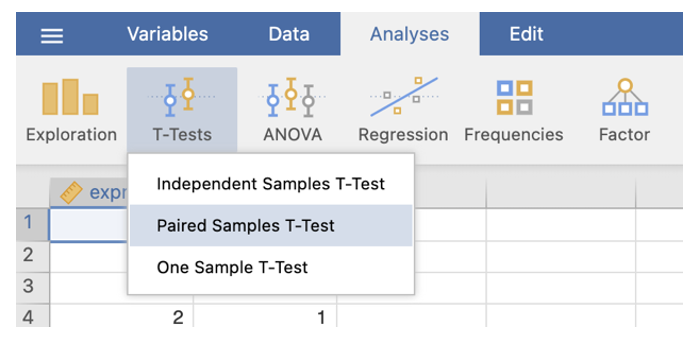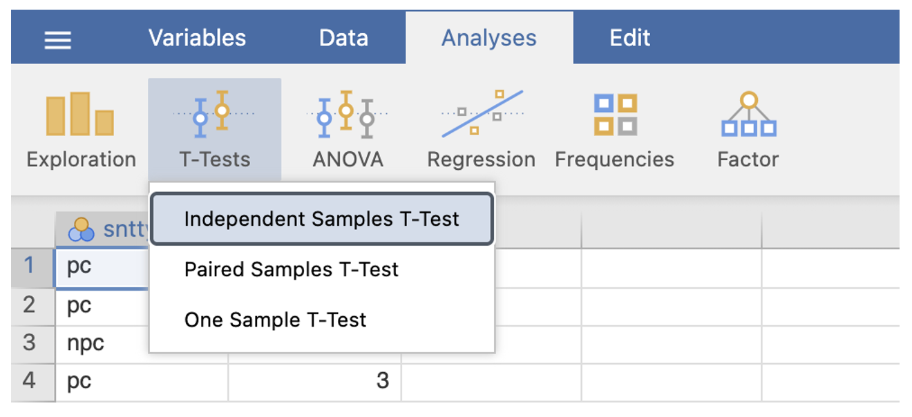 - Go to the Analyses menu. Select T-Tests. Select Independent-Samples T Test…