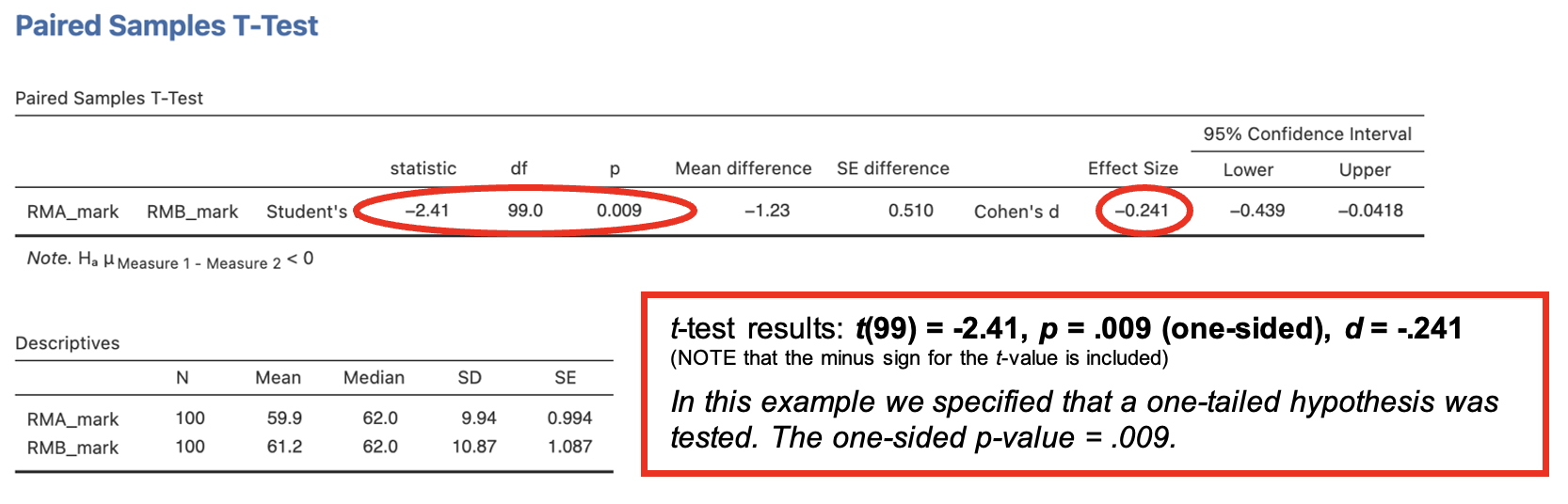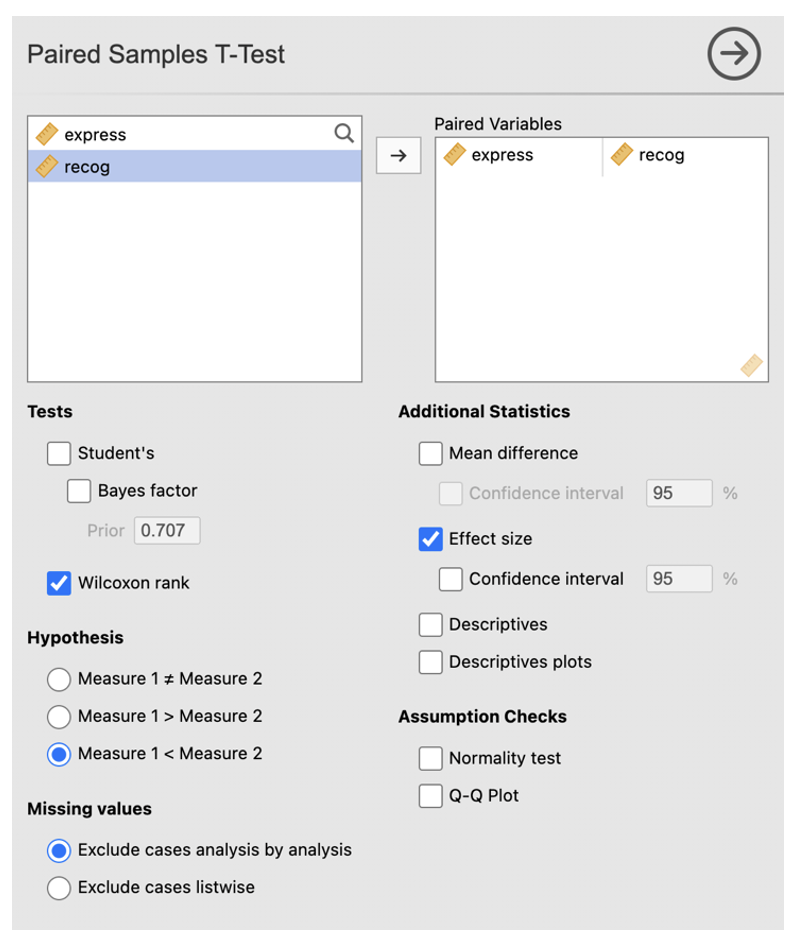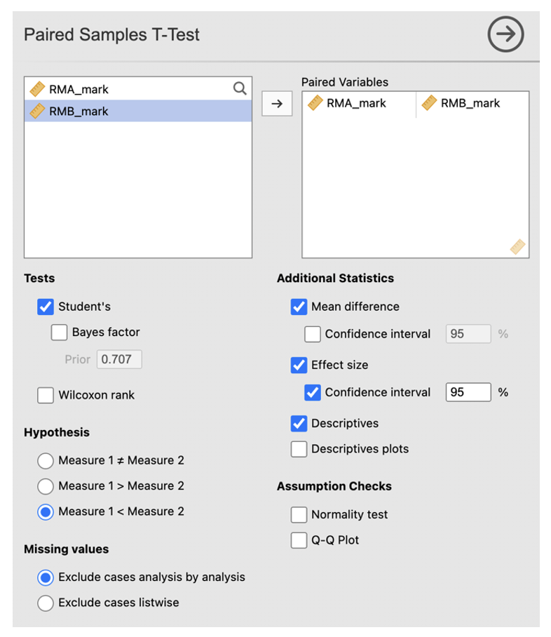 Under the additional satatistics menu make sure that the ‘mean difference’ with ‘confidence interval’; ‘effect size’, with ‘confidence interval’; and ‘descriptives’ are checked.