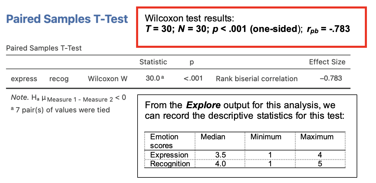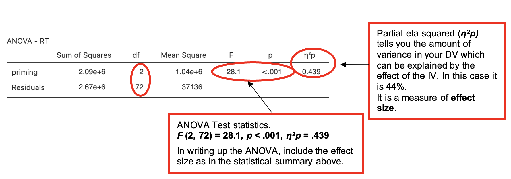 - A summary of the test statistic including probability and effect size