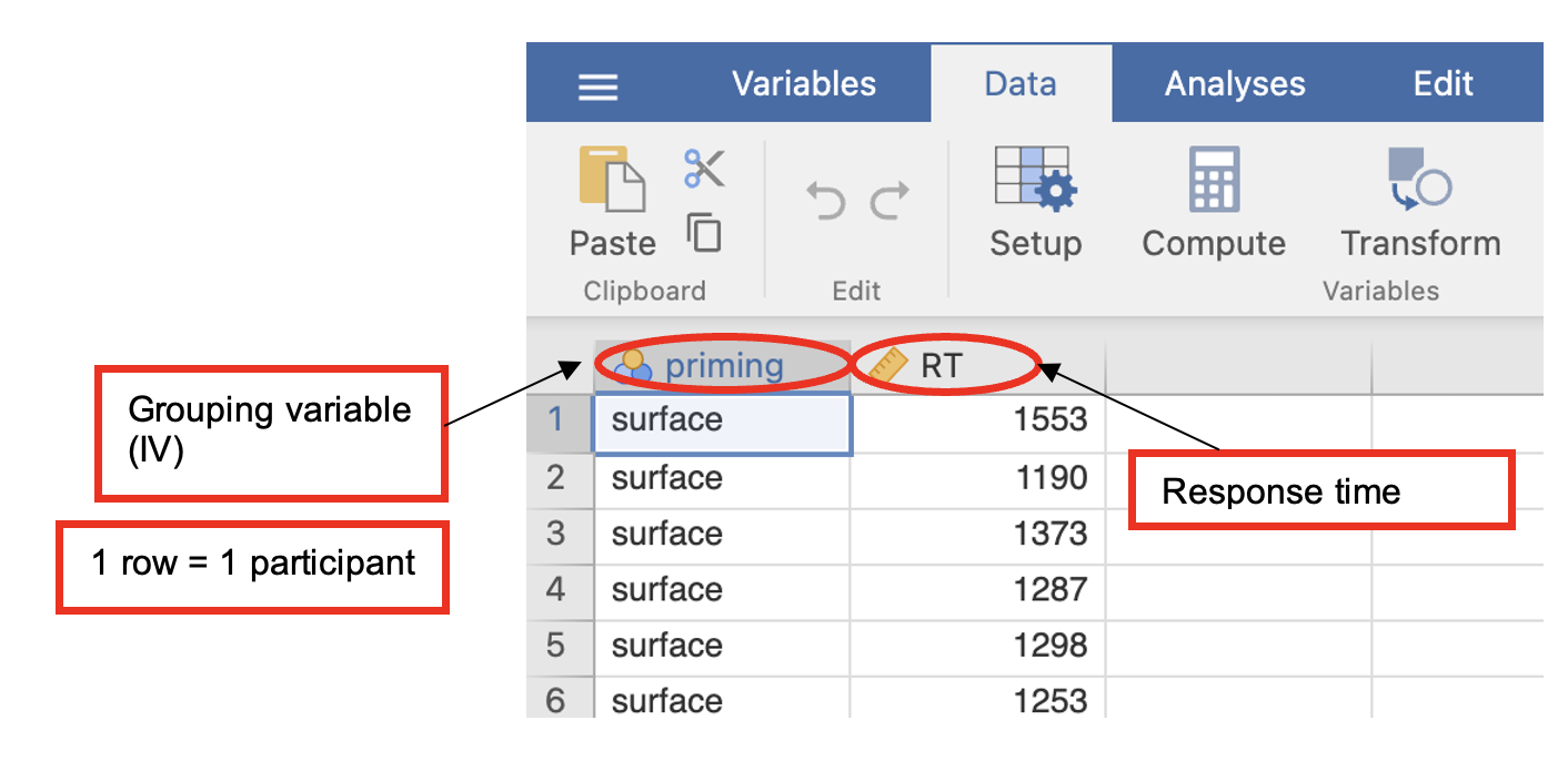 One-way ANOVAs are carried out differently in Jamovi depending on whether the IV is a within- or between-participants factor. You will have had some experience in RMB with one-way between-participants ANOVA – i.e. comparing two or more groups. The following sections go over how to perform one-way between-participants ANOVA. In the next workshop, one-way within-participants ANOVA will be introduced.