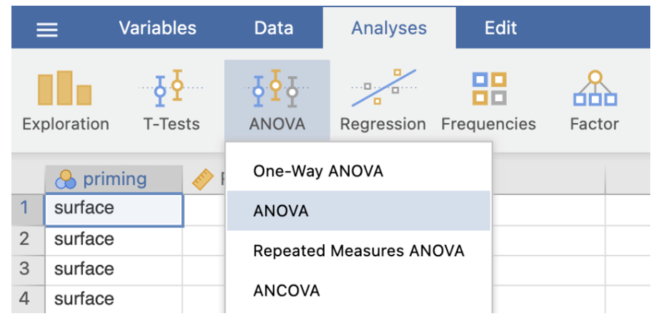 - Go to Analyses -> ANOVA -> ANOVA