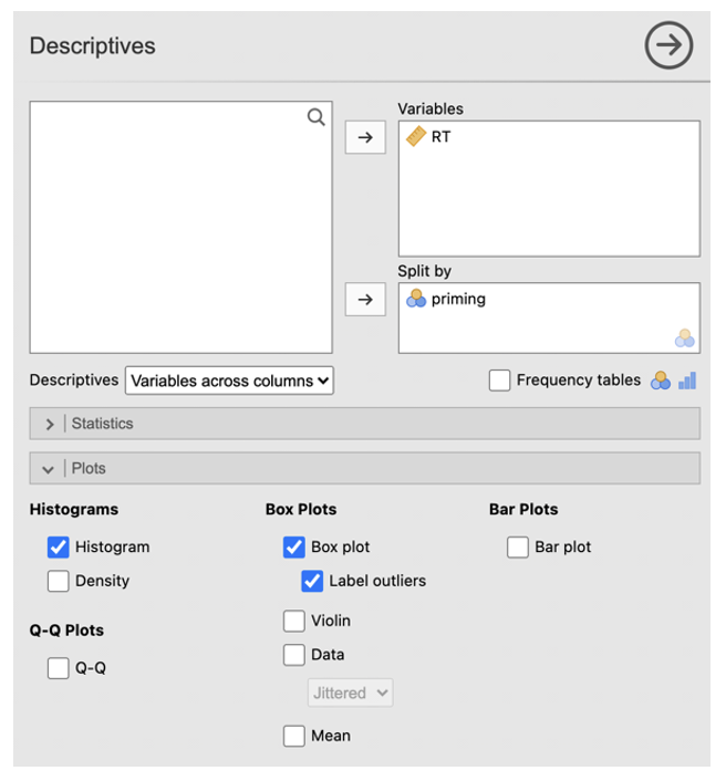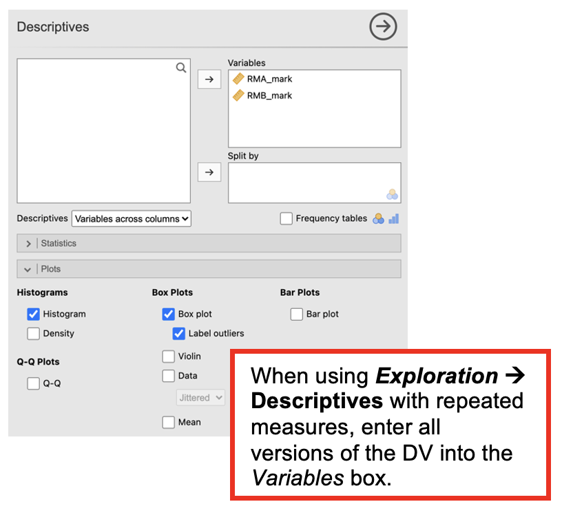 - Click Analyses -> Exploration -> Descriptives. In the dialog box, enter the DV into the ‘Variables’ box. Enter the IV into the ‘Split by’ box.