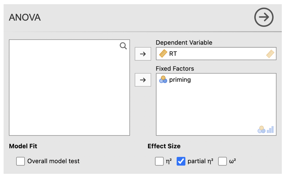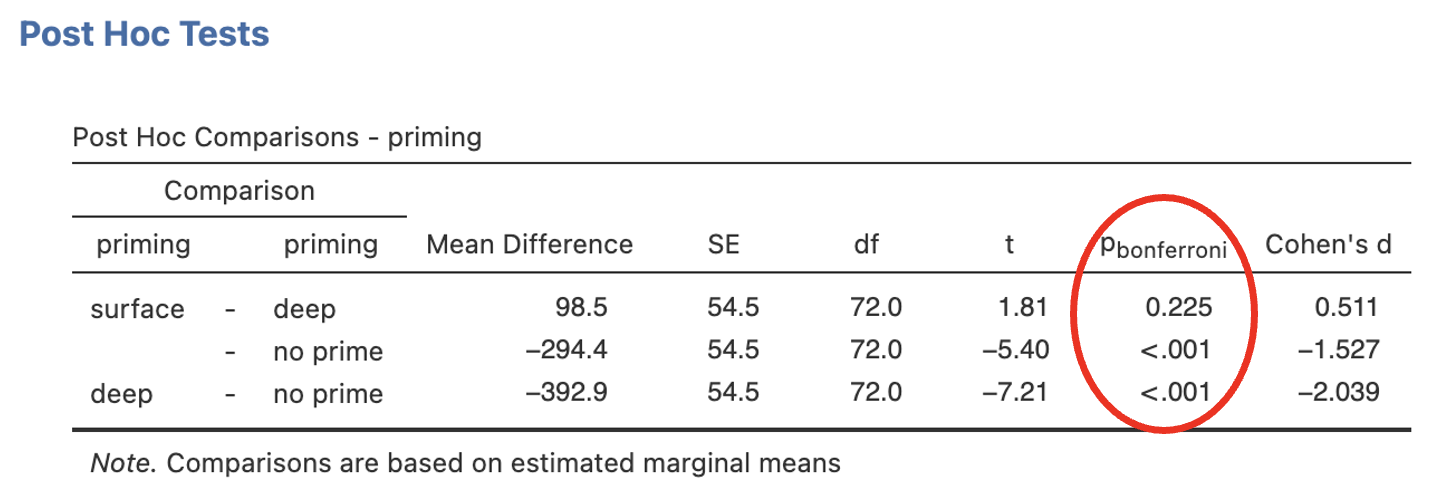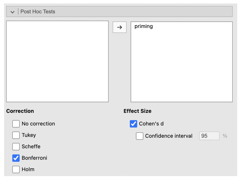 - Click on the ‘Post Hoc Tests’ menu. Add ‘priming’ to the right-side box. Select ‘Bonferroni’ under ‘Correction’ and check the ‘Cohen’s d’ box under Effect Size.