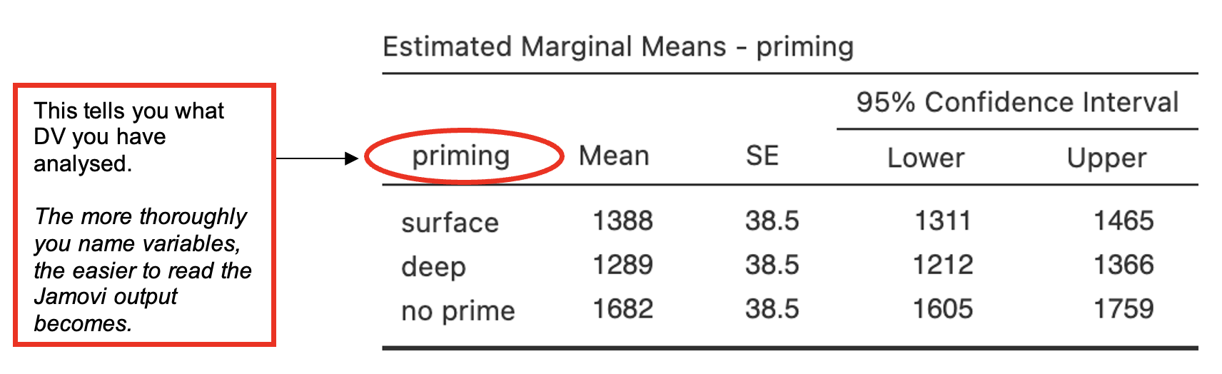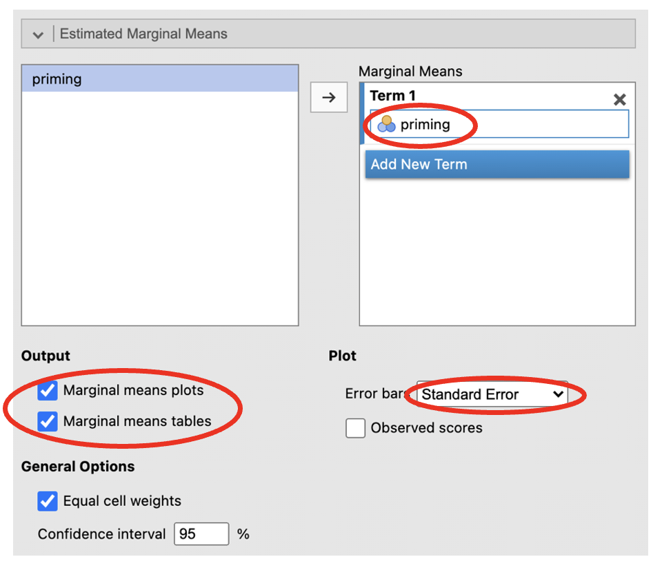 - Click on the ‘Estimated Marginal Means’ menu. Add ‘priming’ to the ‘Term 1’ box. Select ‘Marginal means plots’ and ‘Marginal means tables’ under ‘Output’ and change the ‘Error bars’ drop down to ‘Standard Error’.