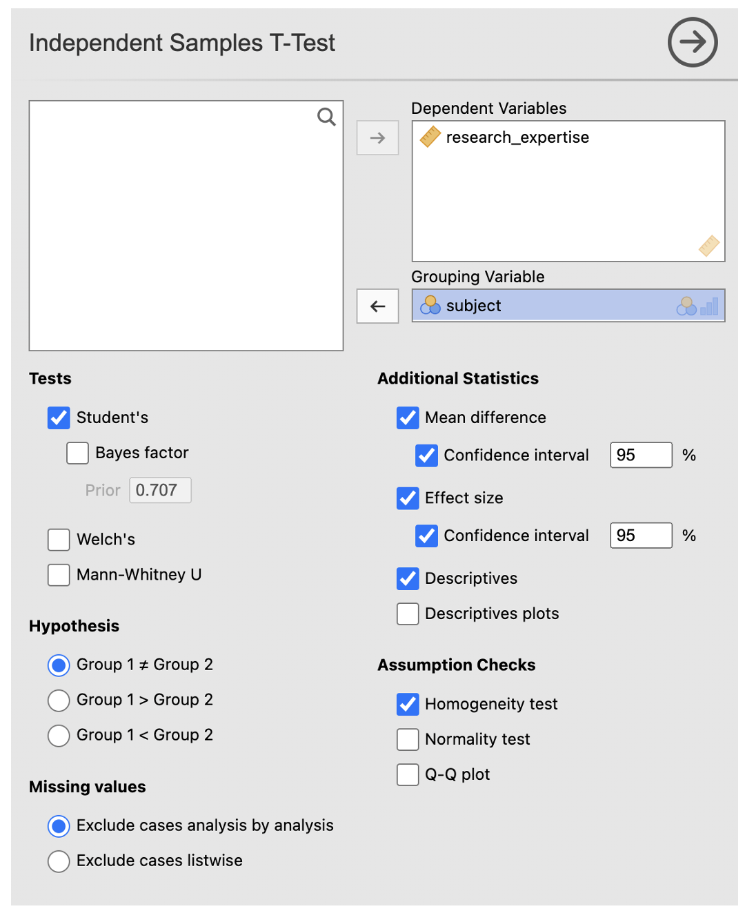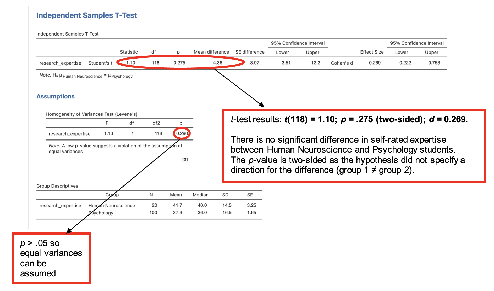In this example, we test the two-sided hypothesis that there is a difference in the self-rated level of research methods expertise of psychology and human neuroscience students in response to a question asking participants to rate their expertise on a scale of 0 to 100.