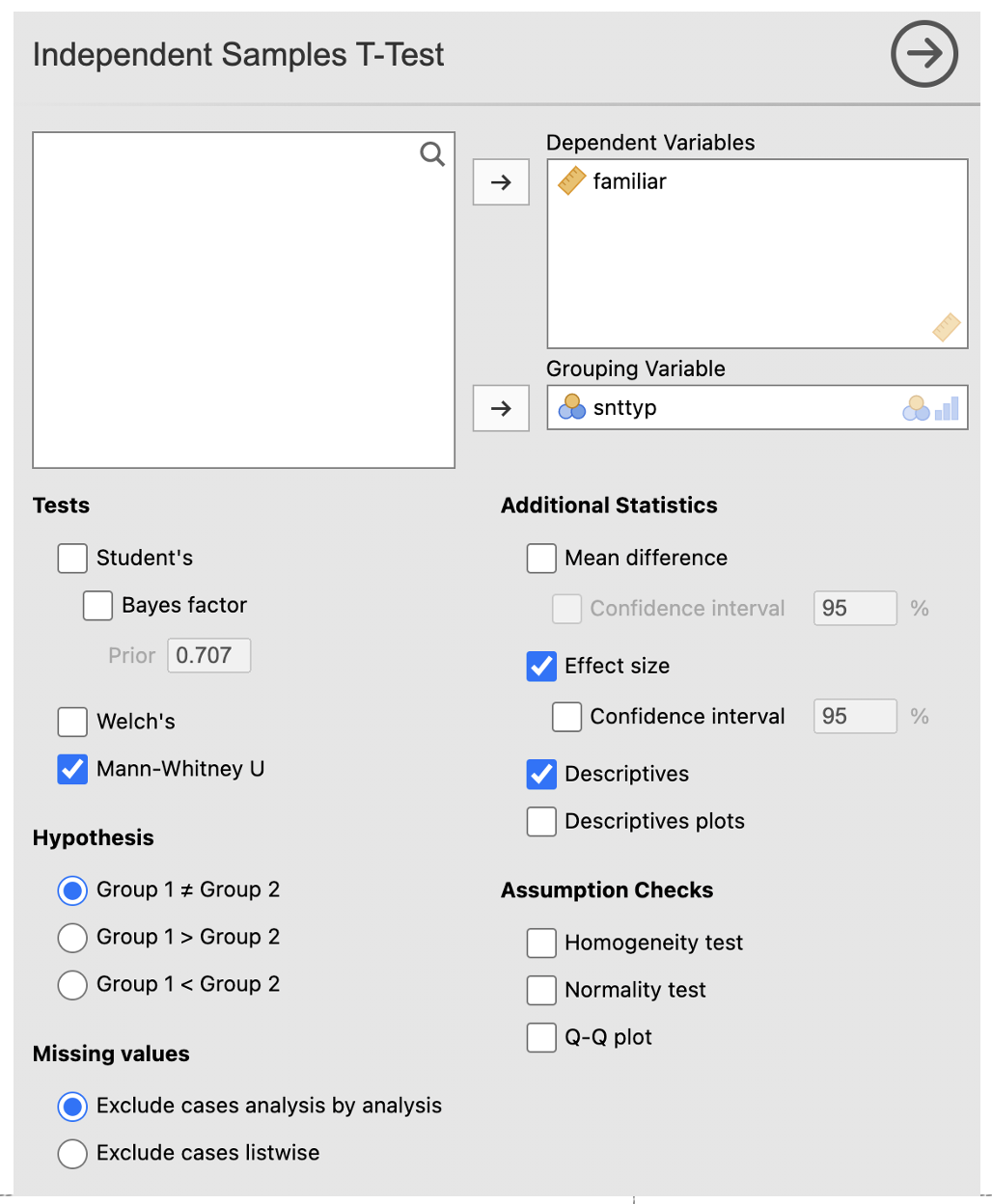 - In the ‘Tests’ section, deselect ‘Student’s’ and select ‘Mann-Whitney U’.