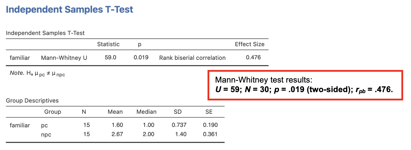 The Jamovi output should look like this: * The Independent Samples T-Test table shows the value of Mann-Whitney’s U to be 59.0. The rank biserial correlation provides a measure of effect size (rpb = .476). The p-value is .019. We conclude that there is a significant difference in familiarity ratings for pc compared to npc sentences. To check the direction of the difference and get some idea of this effect, we would examine the medians for these data. * The Group Descriptives table shows the number of participants in each group and presents the mean, median, standard deviation and standard error of the mean for each group. The mean scores for the groups are NOT reported. Report median scores instead.
