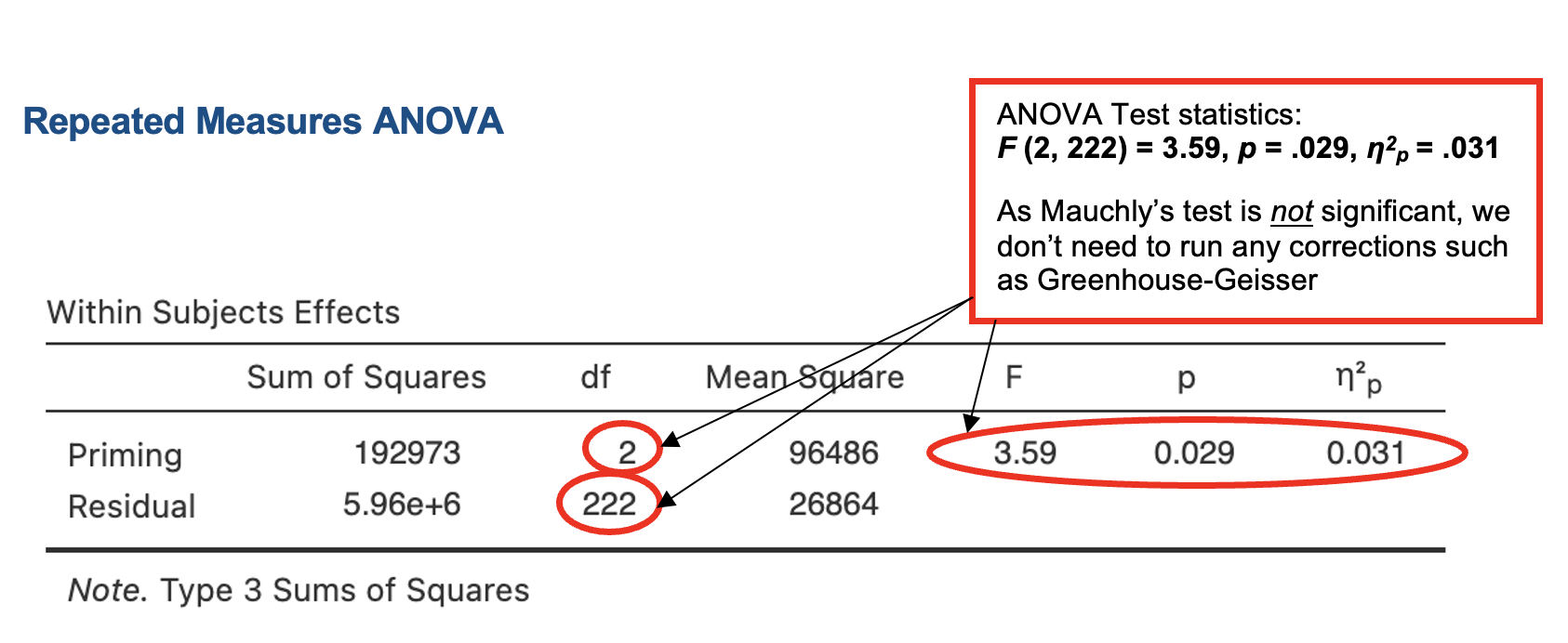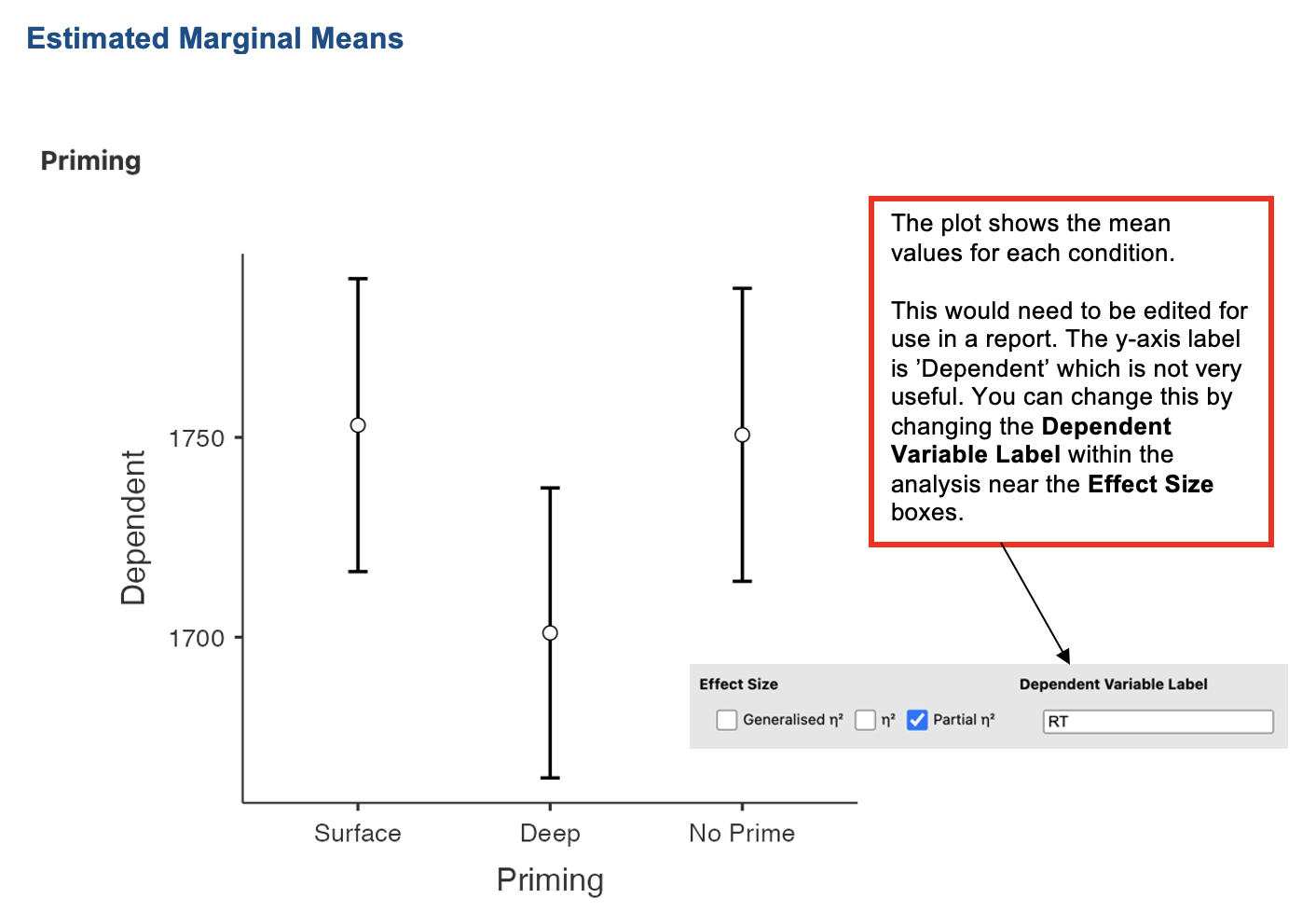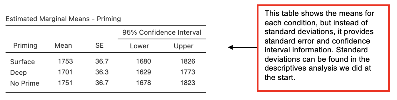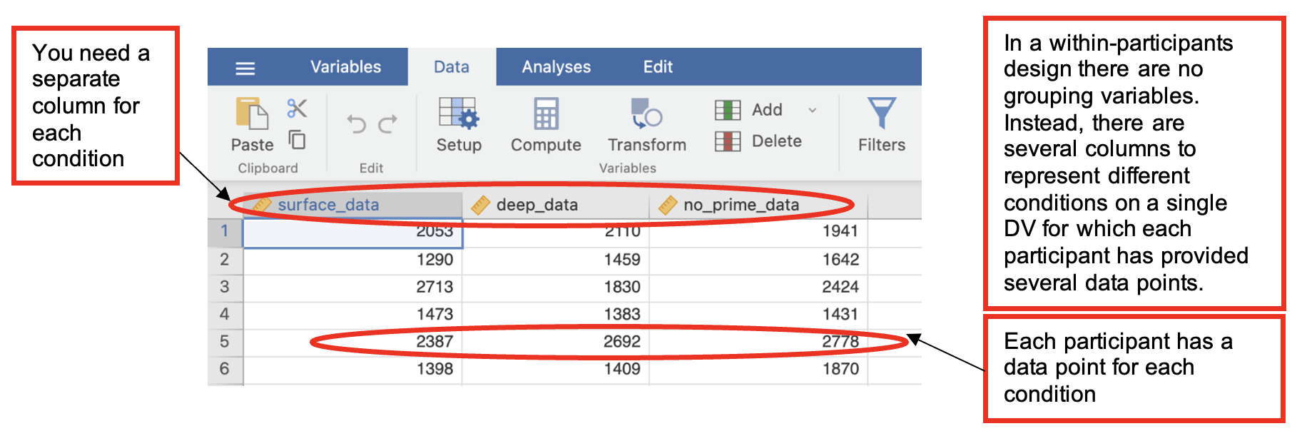 There is still one DV (response time) and one factor (type of priming), with 3 levels (surface, deep, no prime). However, now the factor is within-participants (or a ‘repeated measure’).