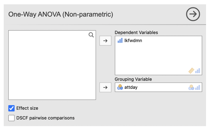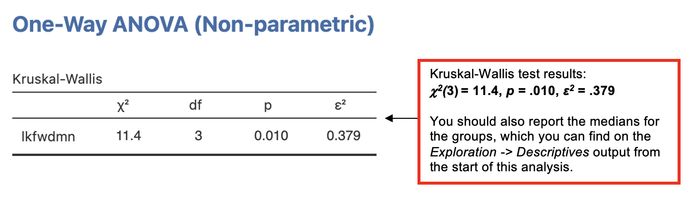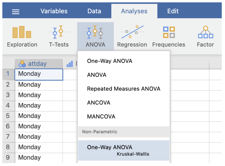 - Go to Analyses -> ANOVA -> One-Way ANOVA Kruskal-Wallis (under non-parametric)