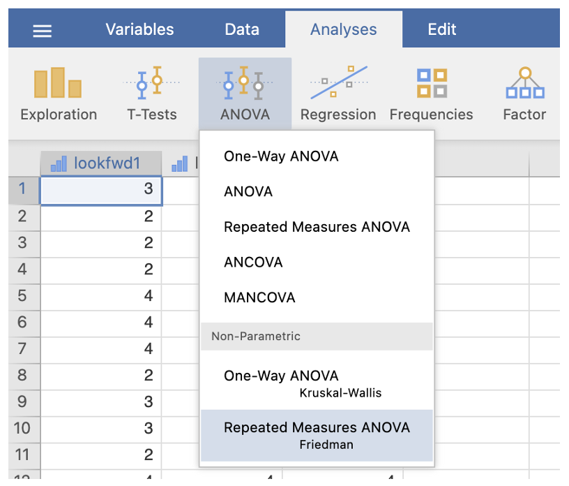 - Go to Analyses -> ANOVA -> Repeated Measures ANOVA Friedman (under non-parametric)