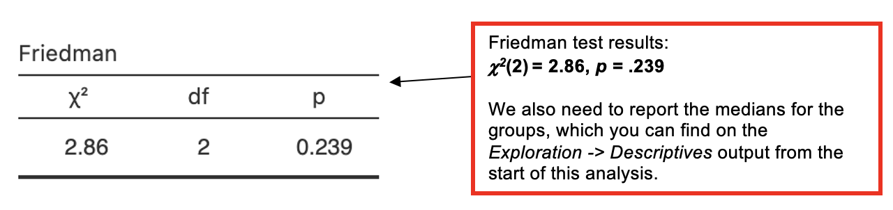 If we did need to carry out post-hocs, we would use Wilcoxon tests (non-parametric comparison between two related conditions) to compare pairs of conditions.