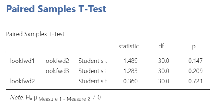Histograms for the three conditions were inspected separately. As the data were skewed and the look forward scores were measured on an ordinal scale, a Friedman test was used. There was no significant effect of time spent studying the module upon look forward scores, chi-sq2() = 2.86, p = . In fact, the median score for all three conditions was identical at , and the hypothesis that time spent studying on the module would affect how much people looked forward to the workshop sessions was .
