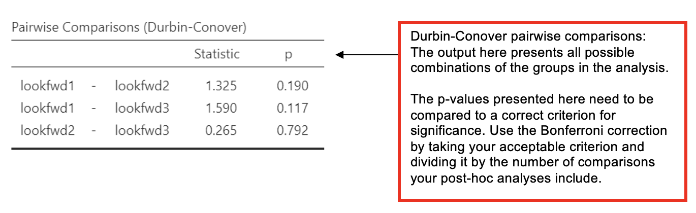 - Alternatively, the Friedman test dialogue on Jamovi also offers Durbin-Conover Pairwise Comparisons, however, this test does not correct for family-wise error.