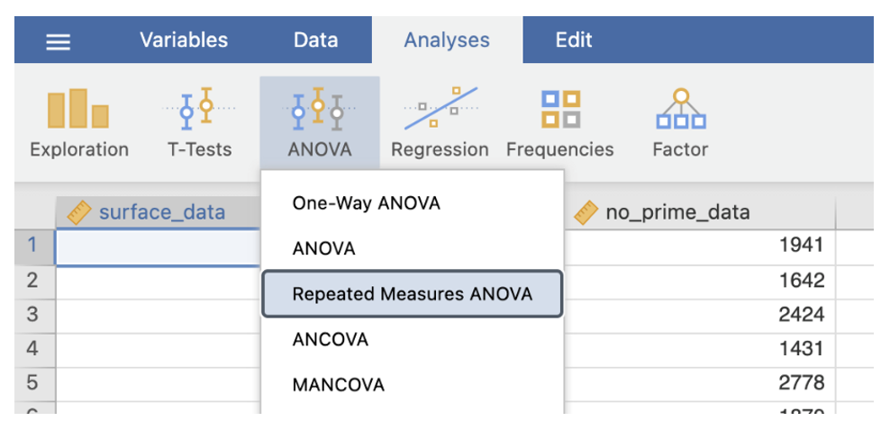 - Go to Analyses -> ANOVA -> Repeated Measures ANOVA
