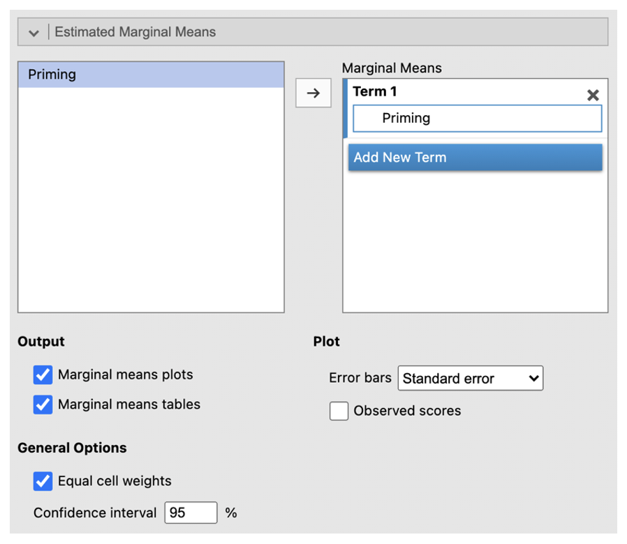 - Go to ‘Estimated Marginal Means’. Enter the IV into the ‘Term 1’ box. Select ‘Marginal mean table’.