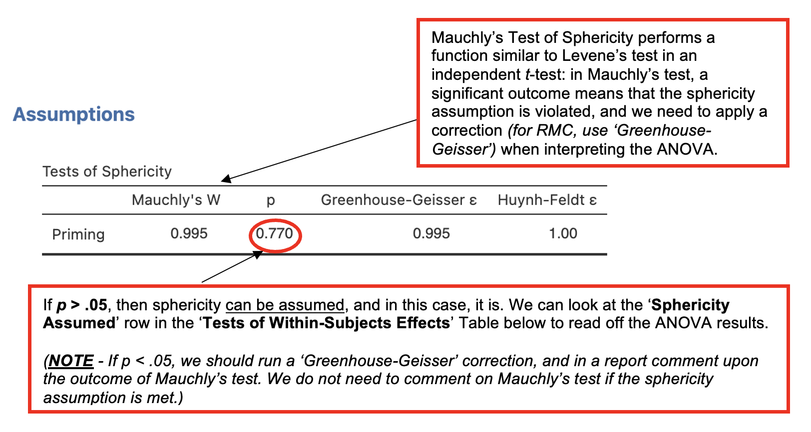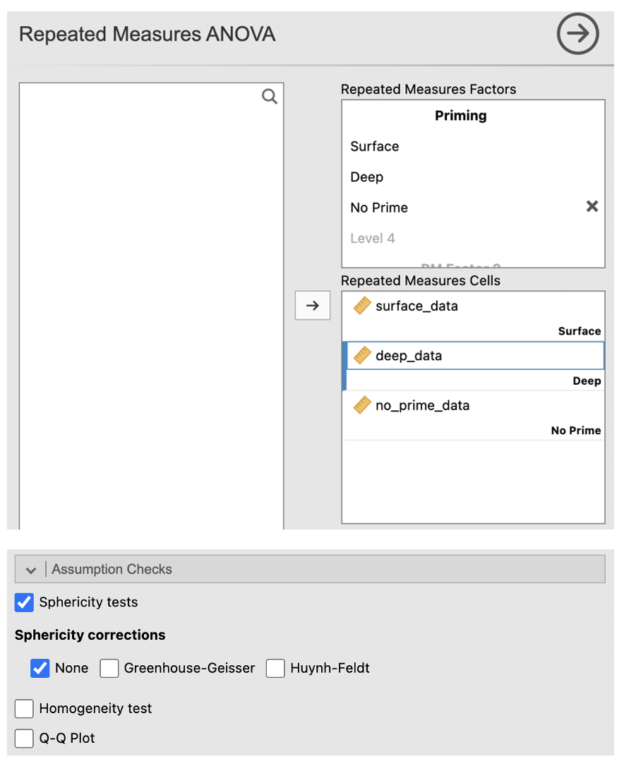 - Go to ‘Assumption Checks’ and check ‘Sphericity tests’