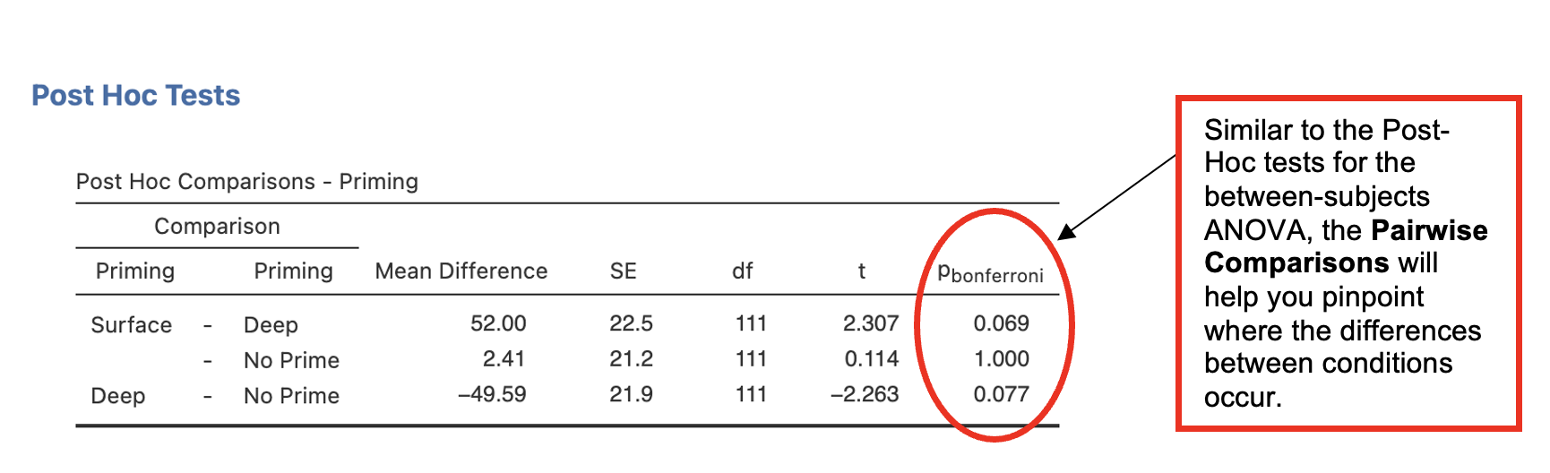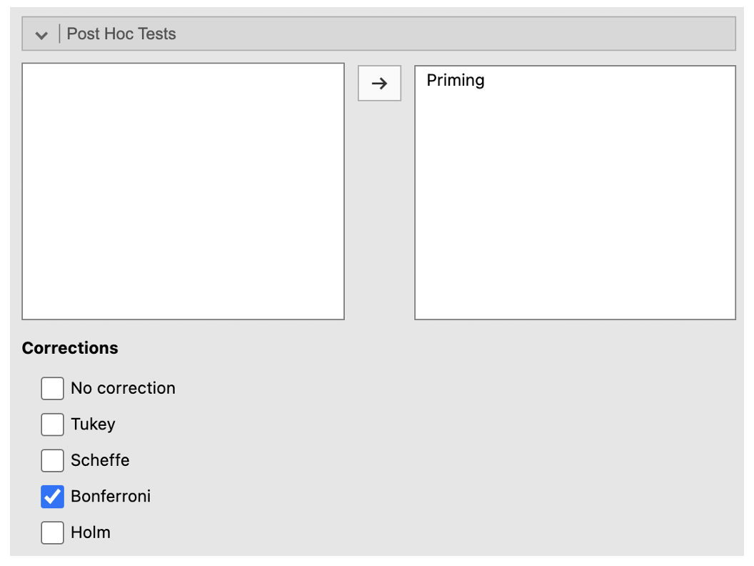 - Got to ‘Post Hoc Tests’. Place ‘Priming’ into the right-side box. Check ‘Bonferroni’ under Corrections.