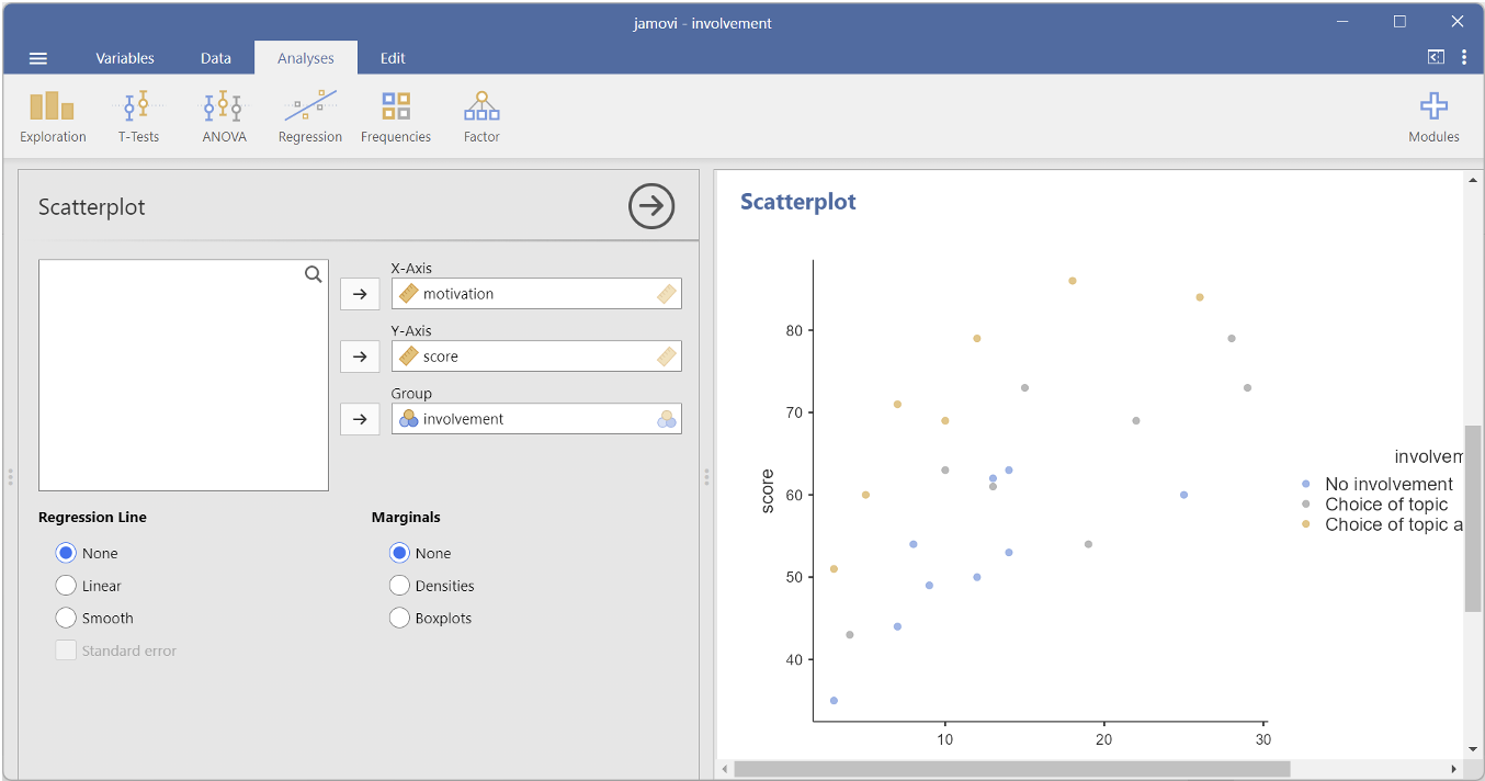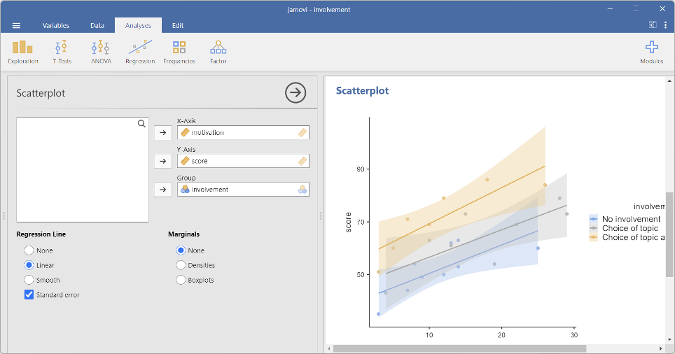 Using Jamovi Exploration to create a scatter plot with regression lines for each group