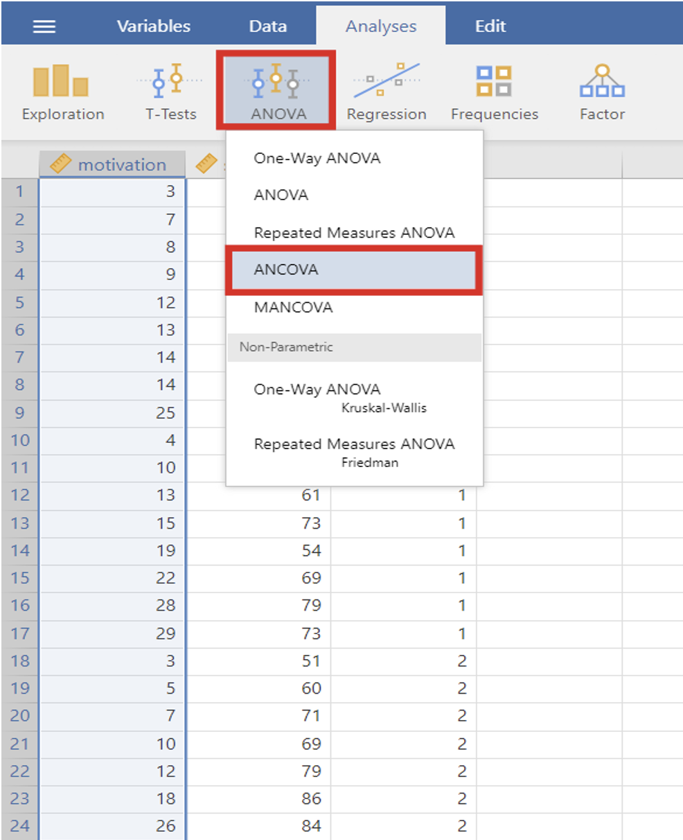 Open the file involvement.csv. In the JAMOVI main window, click on the “Analyses” tab in the top menu, then select “ANOVA” from the list of analysis options. In the ANOVA options, select “ANCOVA” from the dropdown menu.