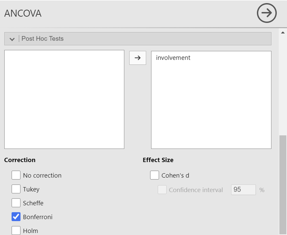 Depending on your specific analysis, you may need to adjust additional options such as select Bonferroni option from ‘correction’ drop down menu and tick on cohen’s D from ‘Effect size’ option.