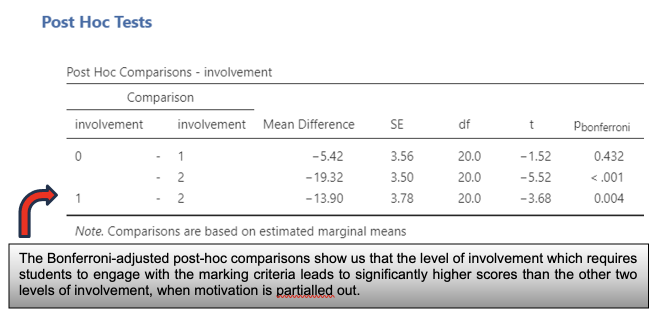 “After adjusting for level of motivation, the adjusted mean examination scores were highest in the ‘choice of topic and engagement with the marking criteria’ group (M = 73.8 marks, SEM = 2.7 marks), with the scores in the ‘choice of topic’ group slightly higher (M = 59.9 marks, SEM = 2.6 marks) than those in the ‘no involvement’ group (M = 54.4 marks, SEM = 2.3 marks). A one-way between participants ANCOVA, using level of motivation as the covariate, found a significant main effect of level of involvement upon examination scores, F (2, 20) = 15.695, p < .001, η2p = .611. Paired comparisons using a Bonferroni correction showed that only the ‘choice of topic and engagement with the marking criteria’ group led to significantly higher scores in examination scores compared to ‘no involvement’ (mean increase = 19.3 marks, p < .001) and ‘choice of topic’ (mean increase = 13.9 marks, p < .001). There was no significant difference between the examinations scores of the ‘no involvement’ and ‘choice of topic’ groups (mean increase = 5.4 marks, p = .432). These findings partially supported the hypothesis that more involvement in the assessment process would improve examinations scores, in that choice of topic and engagement with the marking criteria increased scores, however, choice of topic on its own did not lead to higher scores.”