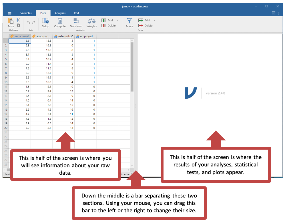 Right now, you are in data view. The data are fictional and created to show that students who are more engaged in their studies are more likely to be academically successful than students who are less enagaged.