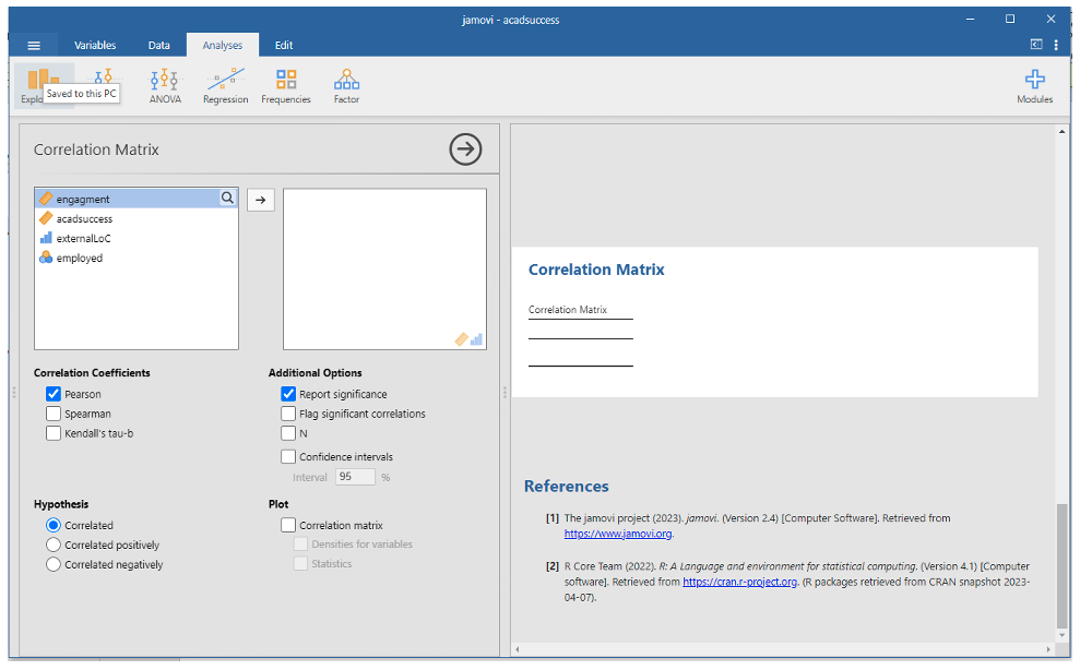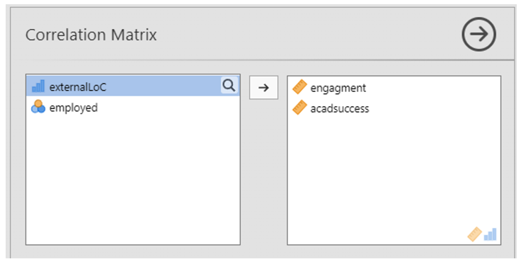 - Drag the “engagement” and “acadsuccess” variables into the “Variables” box