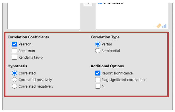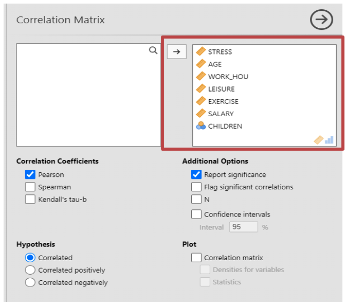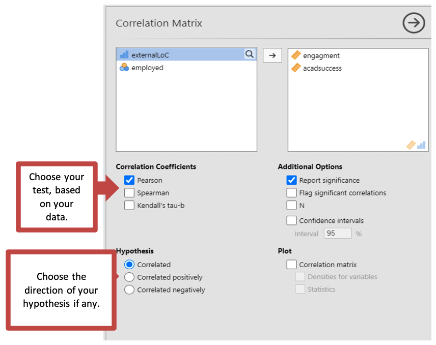 Hypothesis: If your hypothesis has direction of prediction such as a positive or negative correlation between the two variables, you can select either “Correlated Positively” or “Correlated Negatively” as a specific test. If you have no prediction as to the direction of the relationship, you can keep “Correlated”. For this data we should select “Correlated”.