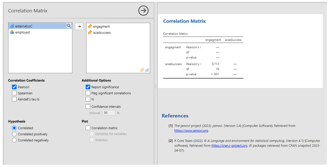 Run a new correlation analysis to investigate the correlation between externality (external locus of control) and engagement. After that, do the same for externality and academic success. What do you find?
