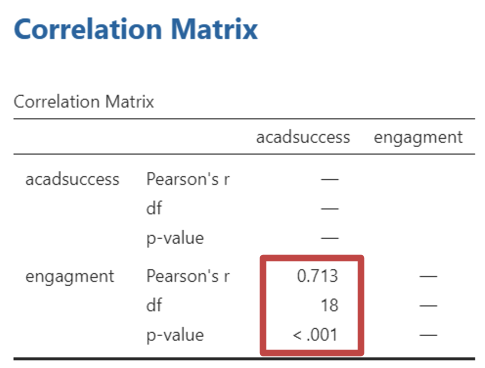 The following is an example of a correlation write-up, using the above example for the correlation between engagement and academic success. Remember that your results might be different if you have cleaned the data in any way (and that is fine – just remember to tell us what you did in your reports).