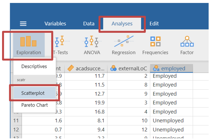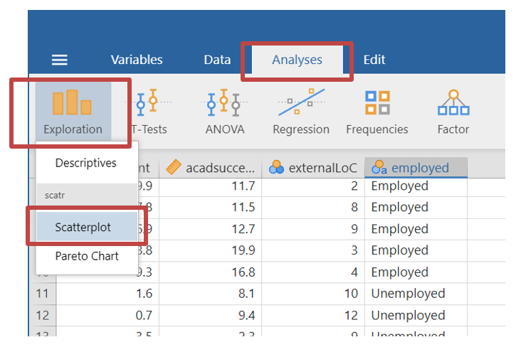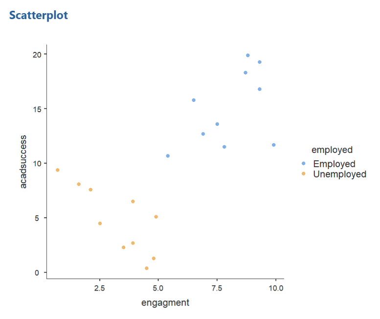 - Jamovi will display a new scatterplot where employed and unemployed participants have their own colour to identify their group.