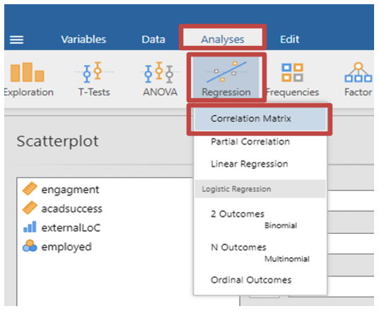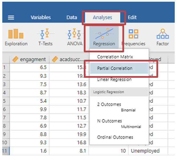 - At the top of the screen select Analysis -> Regression -> Partial Correlation (ensure that the academicsuccess data set is loaded into Jamovi)