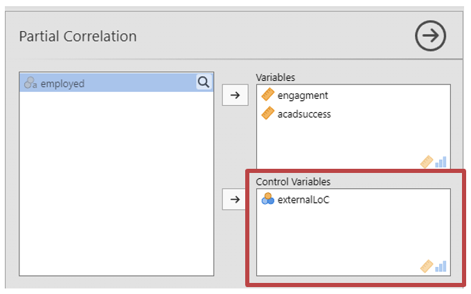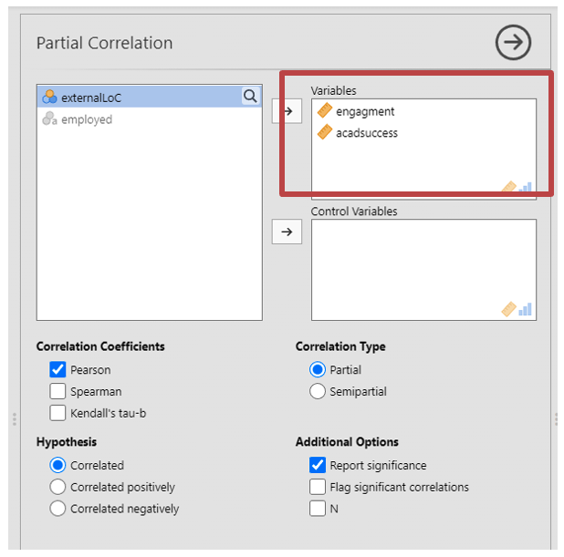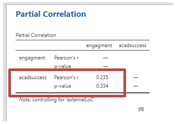 The following is an example of a partial correlation write-up. It refers to the above example for the correlation between engagement and academic success, controlling for externality.