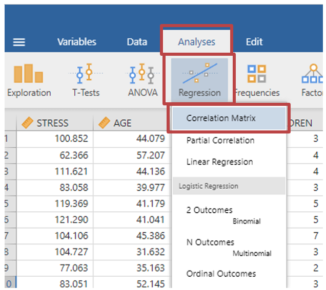 - At the top of the screen select Analysis -> Regression -> Correlation Matrix