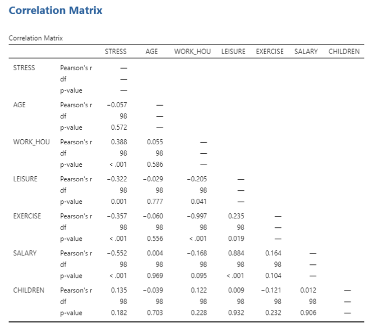 Jamovi can easily calculate correlations between several pairs of variables at once. Download and open the stress data file on Canvas. The file contains made-up data of 100 people. Variables include: