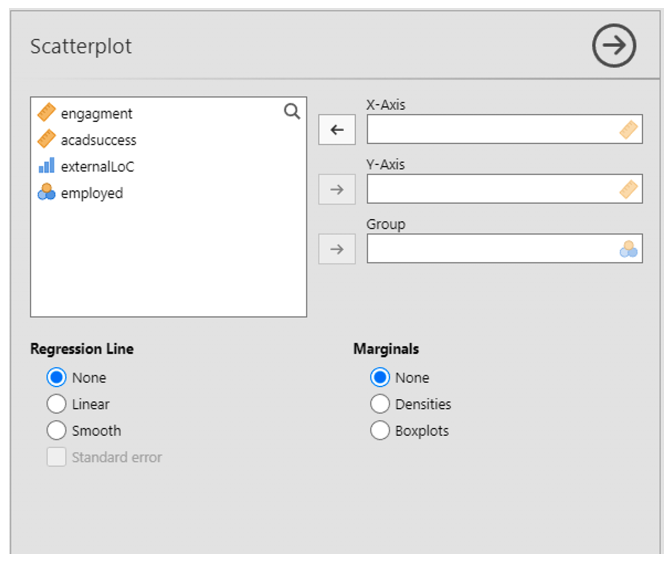 - You will see your variables in this screen. Move the “engagement” and “acadsuccess” variables to the x & y axis. You can do this by dragging the variable names to the x / y axis box, or selecting the variable and clicking the arrows next to the box.
