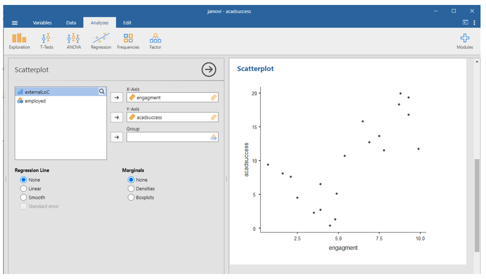 - In the x and y axis place the variables “engagement” and “acadsuccess”. In the group section place the variable “employed”.