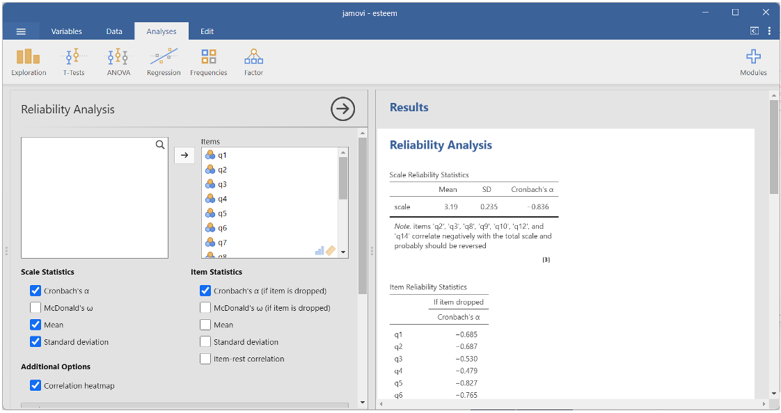 This section takes you through all the steps that you need to perform in an item analysis/reliability analysis of a questionnaire or scale. For part of this, a worked example based on the self-esteem questionnaire presented above is used. Use the “esteem” data file and import this into Jamovi (we covered how last week) then follow the instructions carefully.