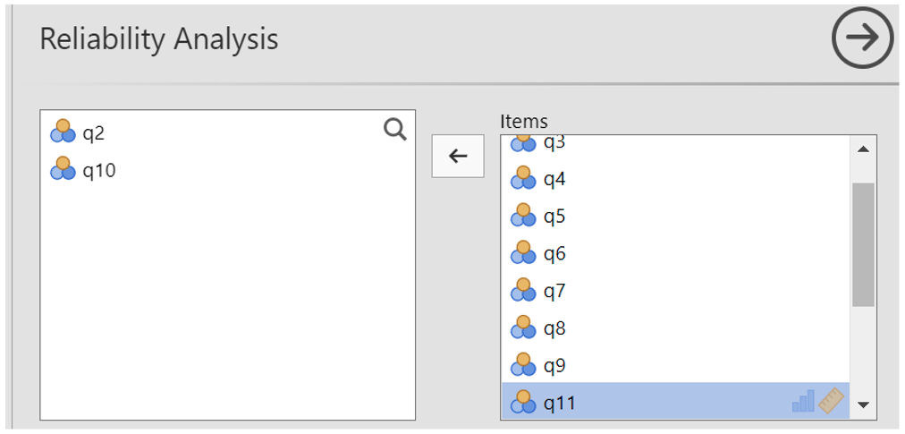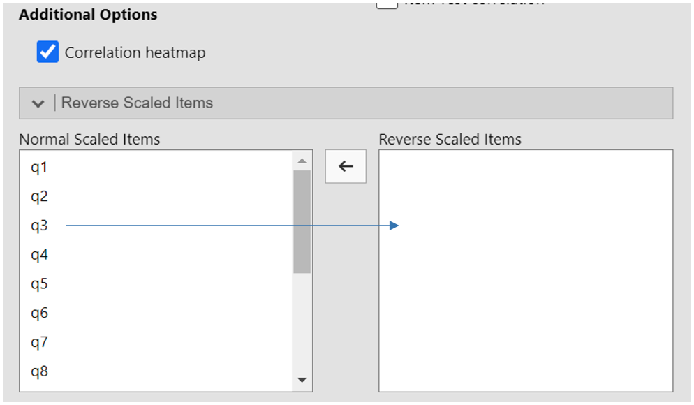 Luckily, Jamovi gives us an option to reverse score items on the same screen as the reliability analysis. You can just transfer the items you want to reverse scale from the Normal Scales Items box to the Reverse Scaled Items box as shown below.