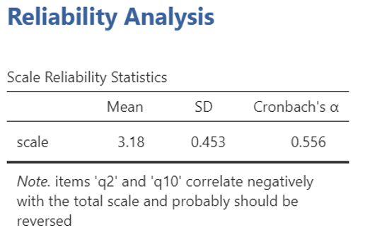 However, we can also see a note under the scale reliability statistics box recommending that we reverse score the following items: Q2, Q3, Q8, Q9, Q10, Q12 and Q14. This is just a recommendation, you need to be the one who makes the decision so check back over the previous task to see which items were negatively worded.