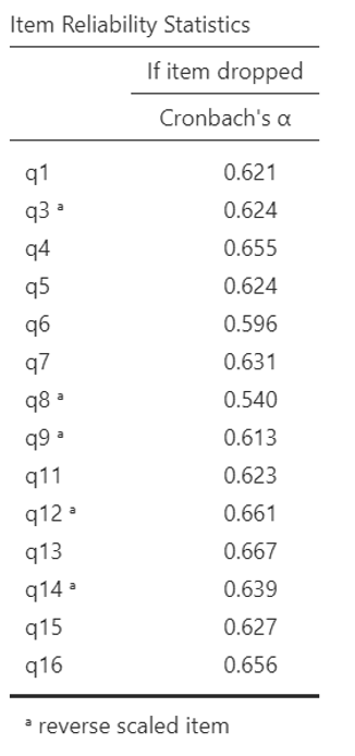 Q16 is a strangely worded question as “I feel depressed on rainy days” because this is more situational. Therefore, I have decided to remove Q16 from the reliability analysis to improve my Cronbach’s alpha (now .656 so definitely meeting the criteria if we round up).