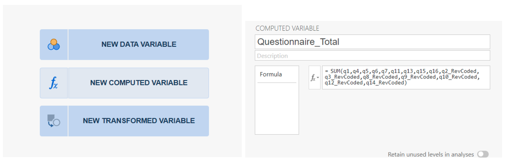 A dialog box will appear prompting you to enter the name for the new variable. Give it a descriptive name, such as “QuestionnaireTotal”. In the formula box below the variable name, enter the formula to calculate the total score. This formula should sum up the scores of all the individual items in your questionnaire for each participant.