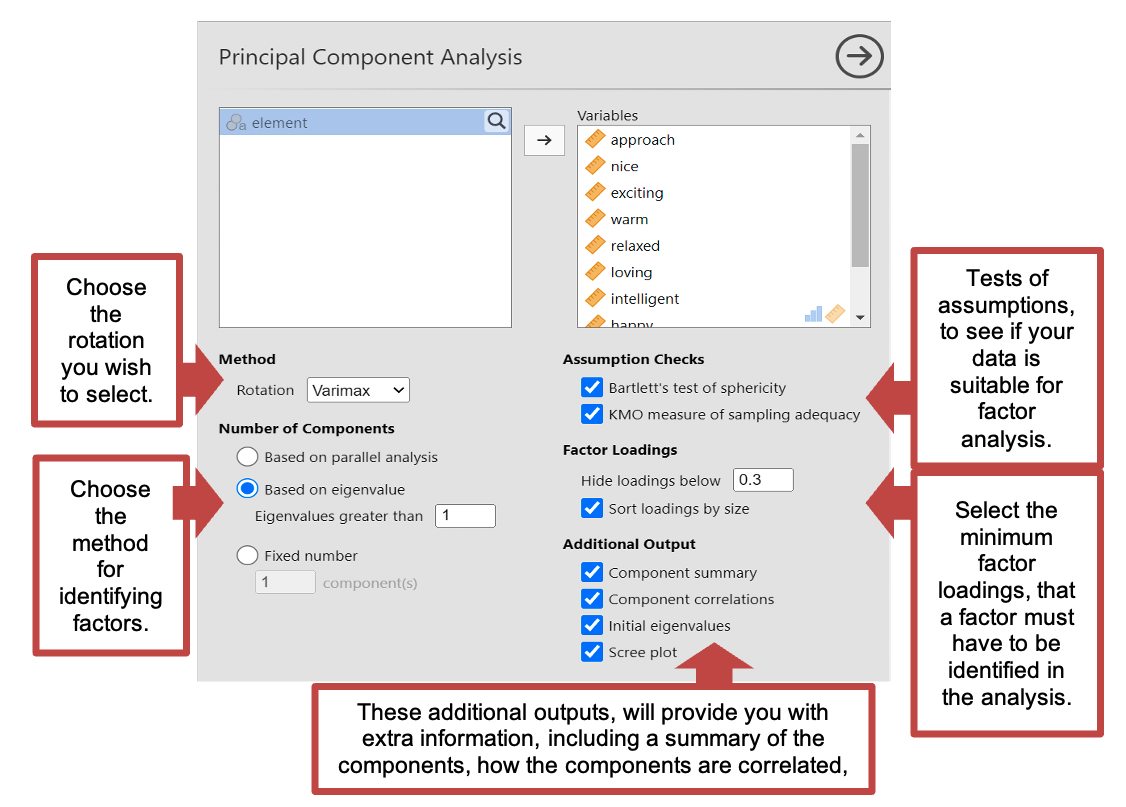 - Factor loadings: Here you can state the minimum factor loading output, for you to want to include the factor.